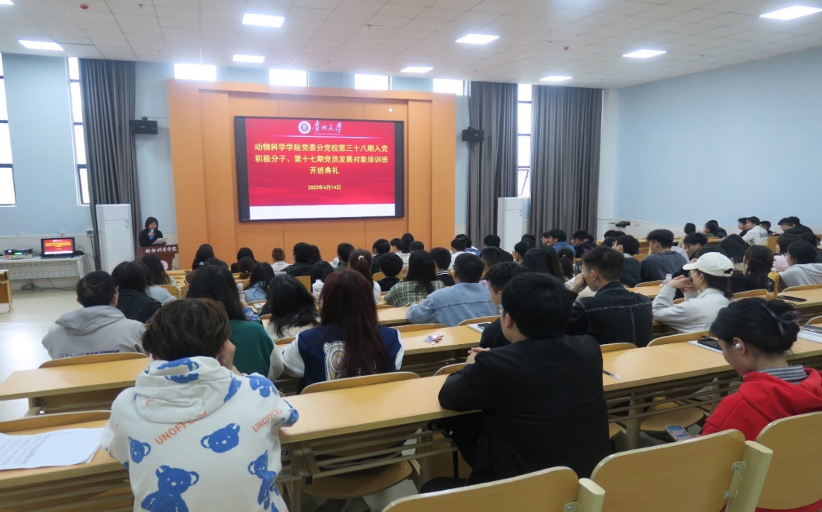 4月14日中午,动物科学公司党委分党校第三十八期入党积极分子、第十七期党员发展对象培训班开班典礼在崇学楼131报告厅举行。公司党委书记罗聃宁、党委副书记杨乐及培训班学员150余人参加典礼。典礼由杨乐主持。